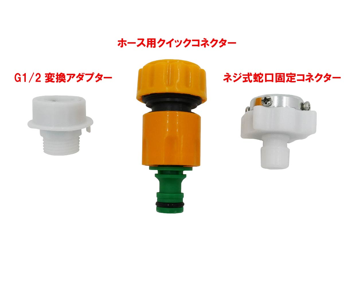 G1/2内ネジ仕様のため、一般的なG1/2外ネジ蛇口にはそのまま接続可能です。G1/2規格外の蛇口にも対応できる「G1/2変換アダプター」、内径18mmのホース経由での測定に便利な「ホース用クイックコネクター」、さらに特殊形状の蛇口にもしっかり固定できる「ネジ式蛇口固定コネクター」を付属しています。